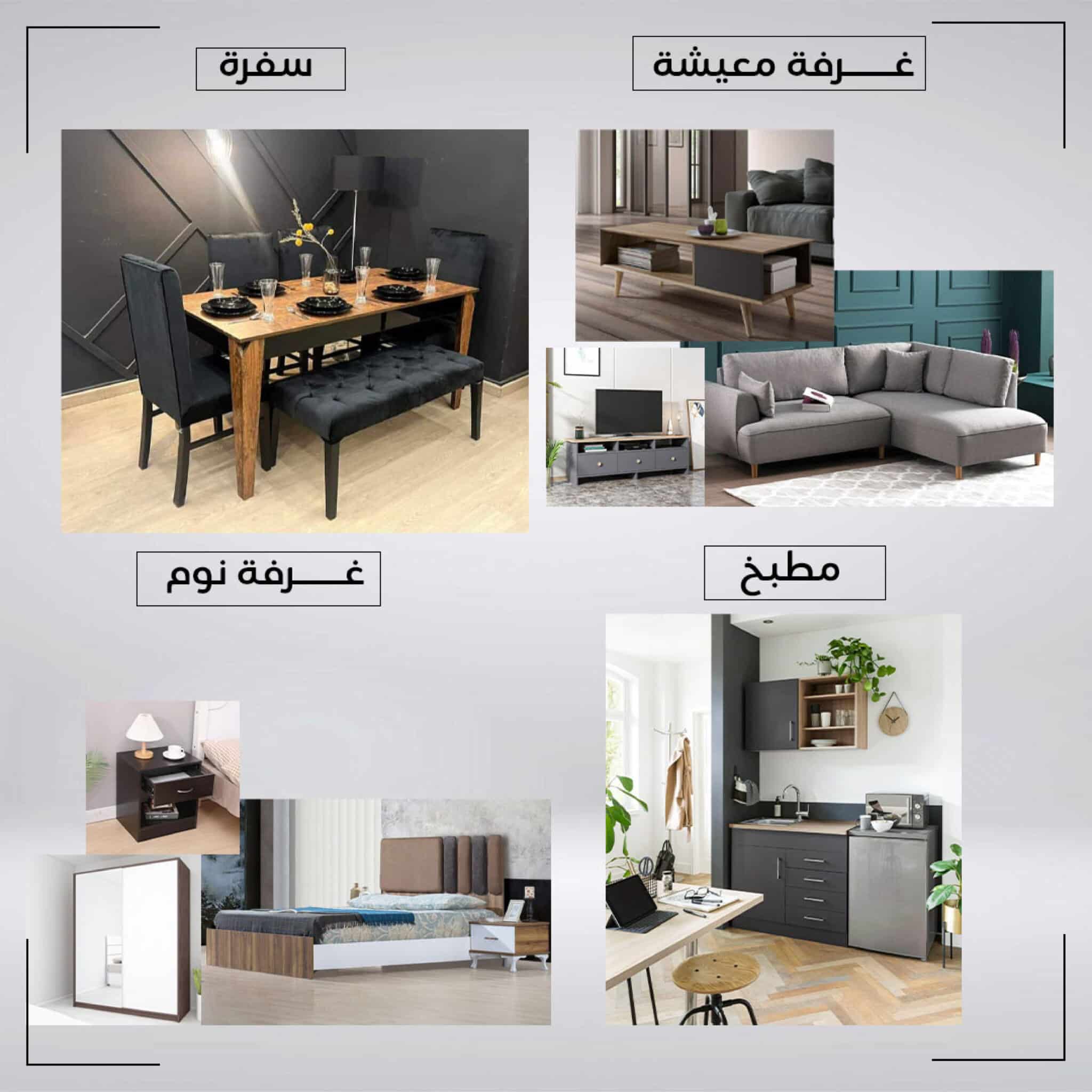 طقم غرف التوفير احصل على منزل متكامل بتصميم أنيق وعملي مع طقم أثاث غرف التوفير الذي يجمع بين الجمال والراحة والتكلفة الاقتصادية في آنٍ واحد. صُمم هذا الطقم بعناية ليمنحك كل ما تحتاجه لتأثيث منزلك بأناقة متكاملة دون عناء البحث أو الازدحام بين التصاميم المختلفة.يتميز الطقم بتصميم حديث متناسق في كل غرفة، مصنوع من خامات عالية الجودة تجمع بين المتانة والفخامة، ليكون الخيار الأمثل للعائلات الباحثة عن الأناقة مع الحفاظ على الميزانية.غرفة المعيشة تضم ركنة مريحة بتصميم عصري تضيف لمسة من الدفء والراحة، مع ترابيزة تلفزيون أنيقة وترابيزة قهوة عملية لتكمل الأجواء المثالية للاسترخاء أو استقبال الضيوف.غرفة النوم صممت لتوفر الراحة والتنظيم مع سرير أنيق وكومود عملي ودولاب واسع لتخزين الملابس والمستلزمات الشخصية بسهولة وذوق رفيع.غرفة السفرة تجمع بين البساطة والأناقة مع ترابيزة سفرة فخمة وأربعة كراسي مريحة بالإضافة إلى بانكيت عملي يضيف لمسة من العصرية ويزيد من عدد المقاعد لتناسب جميع أفراد الأسرة. المطبخ مكون من وحدتين تخزين مصنوعتين بتصميم ذكي ومميز ليمنحك مطبخًا عمليًا وأنيقًا يسهل تنظيمه واستخدامه
