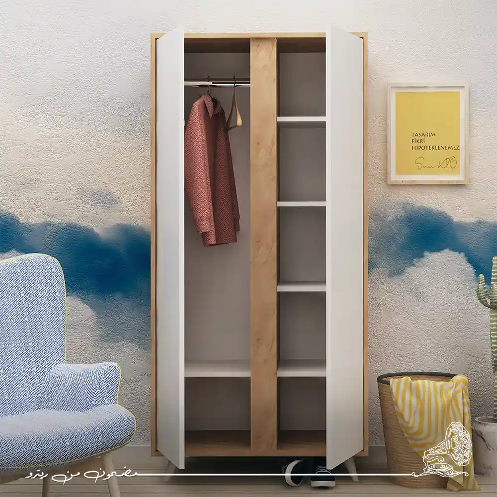 دولاب ملابس مودرن مصنوع من خشب ام دي اف عالي الجودة مصنع الاتحاد الأوروبي، مصمم لتوفير مساحة تخزين عملية ومرتبة. يحتوي على ضلفتين:الضلفة اليمنى تحتوي على 4 أرفف لتخزين الملابس أو الإكسسوارات بشكل منظم الضلفة اليسرى مزودة بـ رف وشماعة لتعليق الملابس الطويلة أو السترات بسهولة.تصميمه العصري بالألوان الأبيض والبيج يمنح الغرفة لمسة أنيقة ويجعل استغلال المساحة أفضل، مع ترتيب كل أغراضك بطريقة عملية وسلسة
