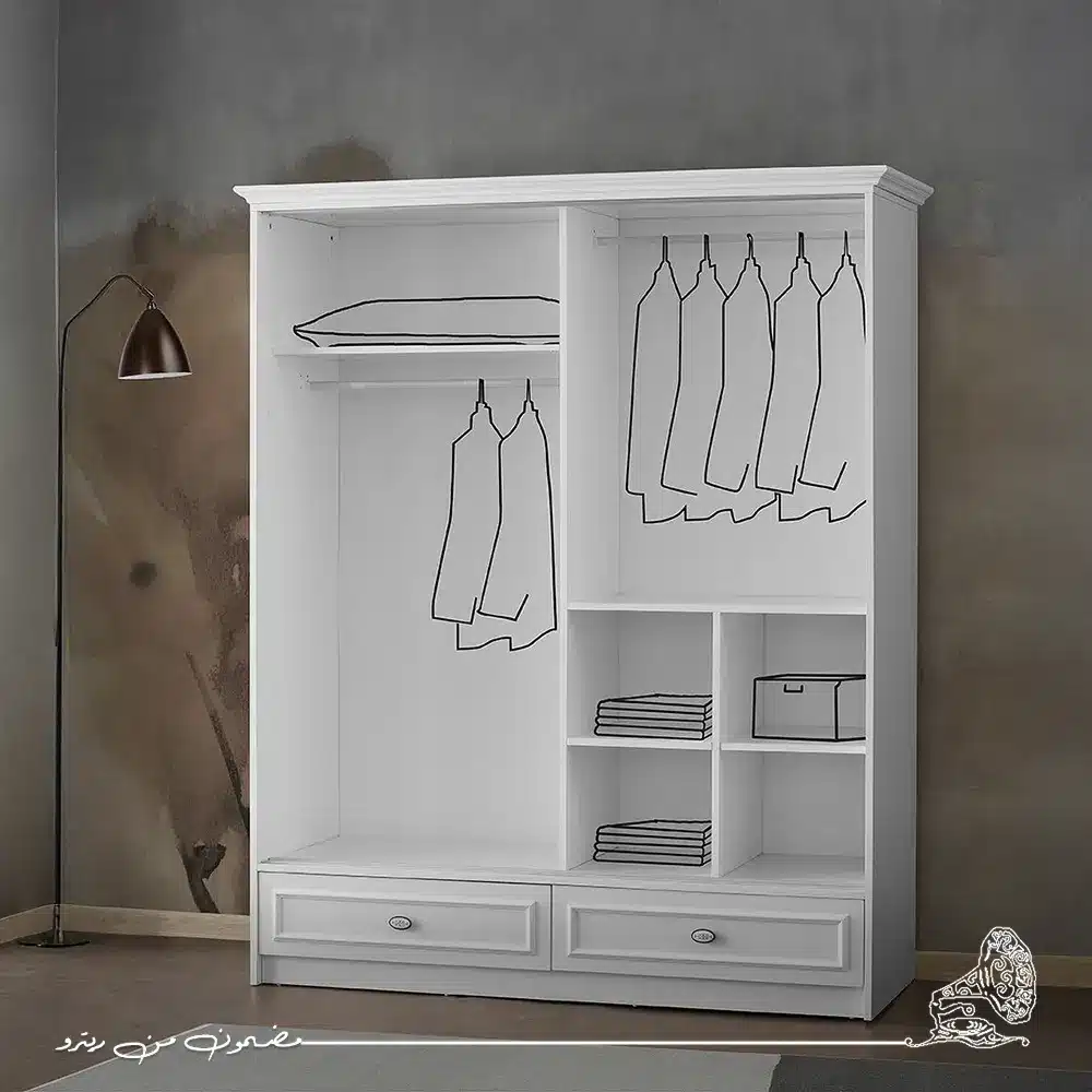 دولاب ملابس أبيض بتصميم أنيق وبسيط يضفي على غرفتك إحساسًا بالنقاء والاتساع. يوفر مساحة منظمة لترتيب الملابس والأغراض بسهولة ويسر، مع لمسة عصرية تناسب جميع ديكورات المنازل. قطعة عملية تجمع بين الجمال والوظيفة لتكمل ديكور غرفة نومك بأسلوب راقٍ ومريح