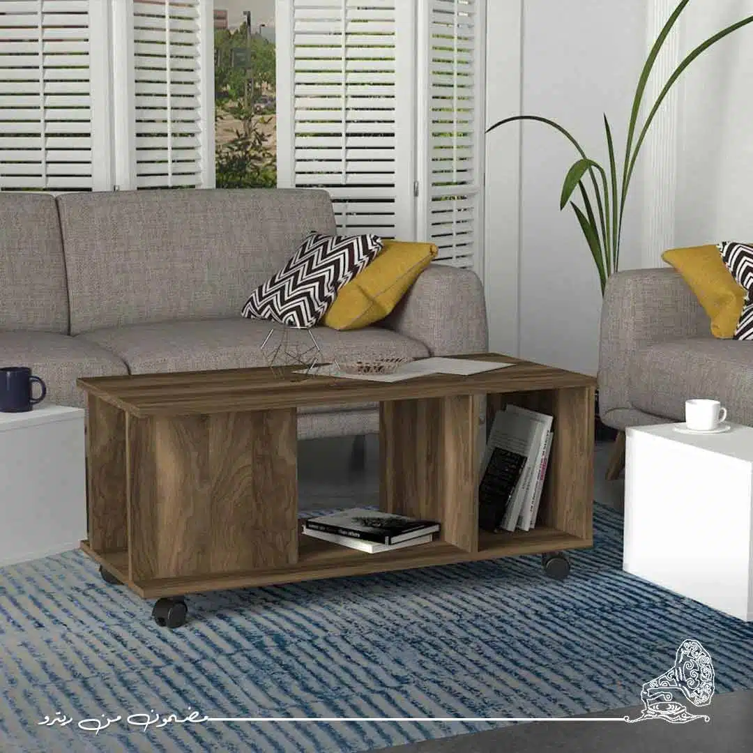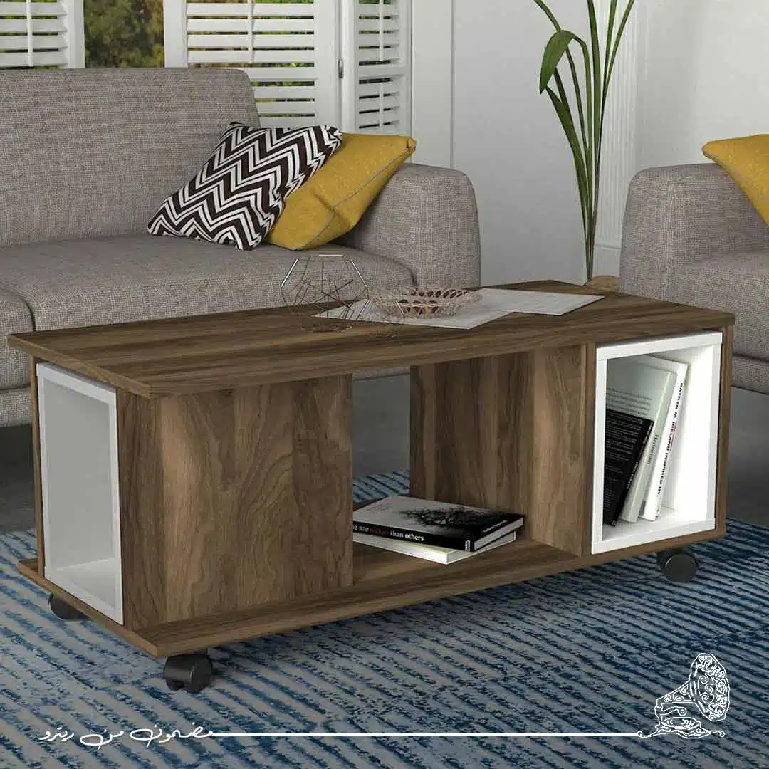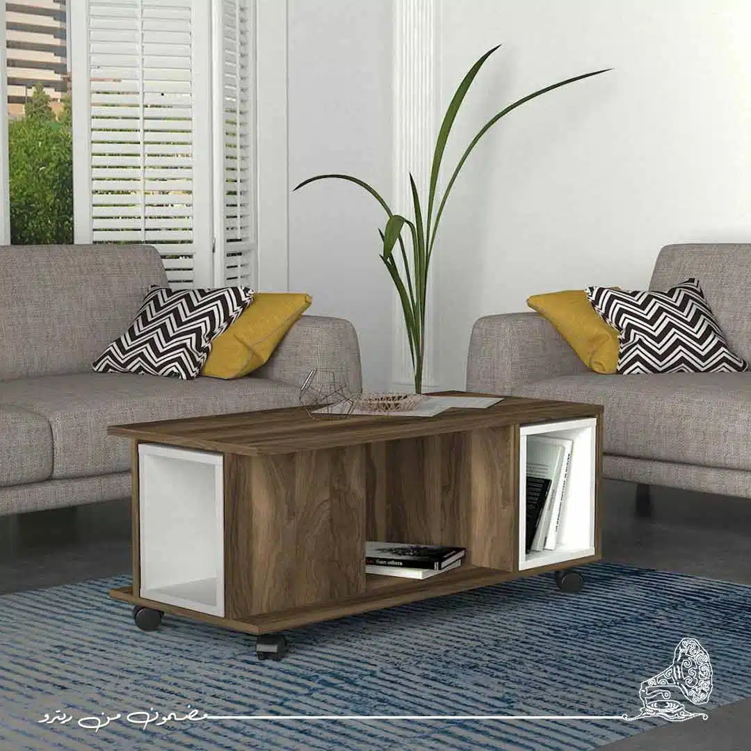 ترابيزة قهوة بتصميم أنيق يجمع بين اللونين البني والأبيض، مما يضفي تباينًا ناعمًا وأسلوبًا معاصرًا على المكان.سطحها المتين يوفر مساحة واسعة لوضع المشروبات أو الكتب أو قطع الديكور.