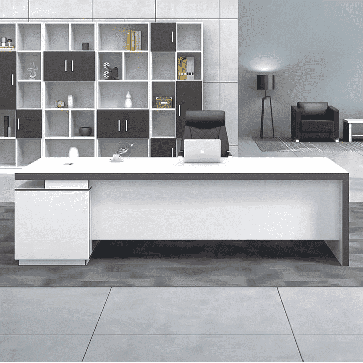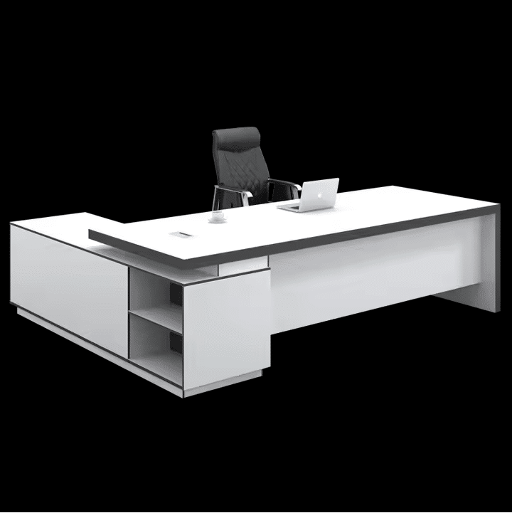 مكتب مودرن باللون الأبيض النقي، تصميمه بسيط وأنيق يوفر مساحة واسعة ومريحة للعمل . سطح عملي ومنظم يعكس صفاء ونقاء المكان، مع خطوط نظيفة تضفي إحساسًا بالانتعاش والهدوء على مكتبك. خيار مثالي للمكاتب العصرية التي تبحث عن التوازن بين الوظيفة والجمال بأسلوب حديث