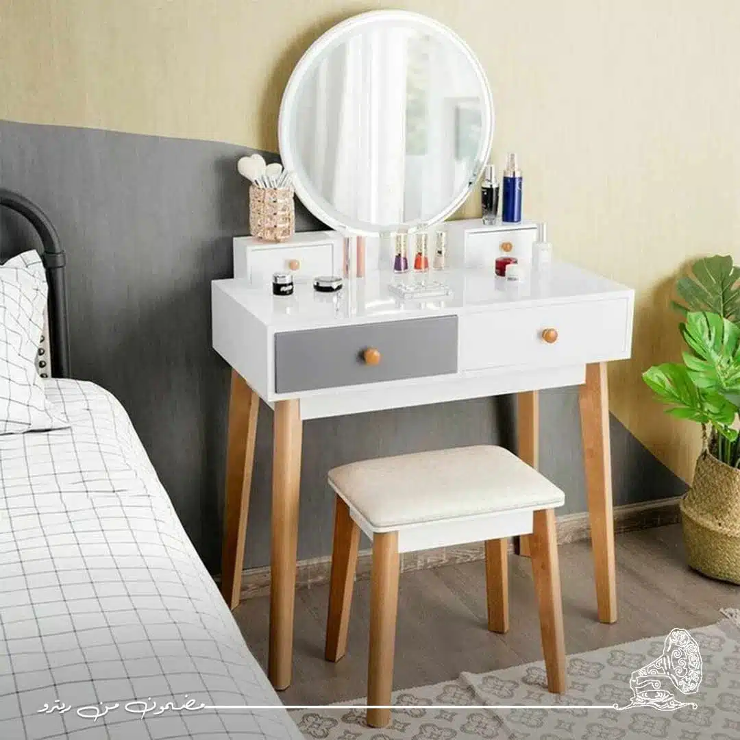 تسريحة مودرن بتصميم عملي يجمع بين الأناقة والراحة في الاستخدام.تاتي التسريحة باللون الابيض النقي قائمة علي ارجل باللون الخشي الدافئ بشكل مميز مما يجعلها قطعة فريدة من نوعها و تضيف المزيد من الجمال علي غرفتك تتميز بحجم مثالي لمساحات الغرف الصغيرة أو المتوسطة، مع درجين للتخزين يساعدان في تنظيم الأدوات الشخصية.يأتي معها كرسي بنفس الطابع العصري، ليكتمل الطقم بتناسق جميل.مثالية لمن يبحث عن تسريحة بسيطة بتفاصيل مميزة