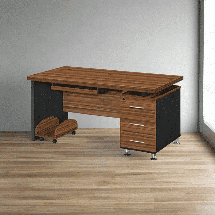 مكتب موظف مودرن بتصميم عملي يجمع بين الخشب الدافئ واللون الأسود العصري، ليمنح مساحة عمل أنيقة ومنظمة. يوفر سطحًا واسعًا للعمل مع تفاصيل تساعد على ترتيب الملفات والأدوات بسهولة، مما يعزز من إنتاجية الموظف ويضيف لمسة احترافية للمكتب. خيار مثالي لبيئات العمل التي تبحث عن التوازن بين الجمال والوظيفة