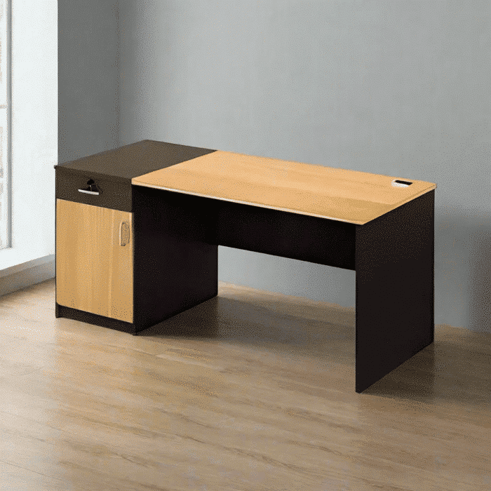 مكتب موظف 120سم ارتقِ بمكتبك مع هذا المكتب العصري الذي يجسد التوازن المثالي بين الأناقة والكفاءة، حيث يتميز بتصميم مودرن وجذاب يجمع بين متانة الأداء وجمالية المظهر التي تلائم أرقى الأذواق. التباين الساحر هو العلامة الفارقة لهذا المكتب، فهو يدمج بين دفء اللون الخشبي العصري وتفاصيل اللون الأسود الجذابة ليمنحه مظهراً احترافياً لافتاً يلائم جميع الديكورات المكتبية الحديثة. صُنع المكتب بجودة استثنائية من خشب عالي الجودة لضمان سطح عمل صلب ومقاوم يدوم طويلاً، مما يجعله استثماراً حقيقياً في بيئة عملك. بفضل مقاساته المدروسة، فهو مثالي للمساحات الحديثة، حيث يوفر سطحاً واسعاً ويزودك بحلول تخزين ذكية عبر وحدة عملية تشمل درج واحداً للمستلزمات الصغيرة وضلفة مغلقة لتخزين الملفات والأغراض الشخصية.