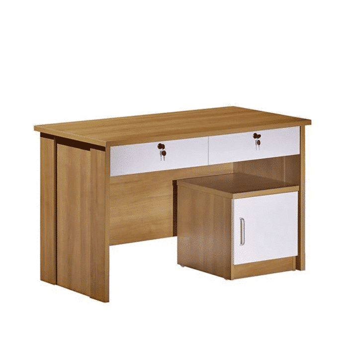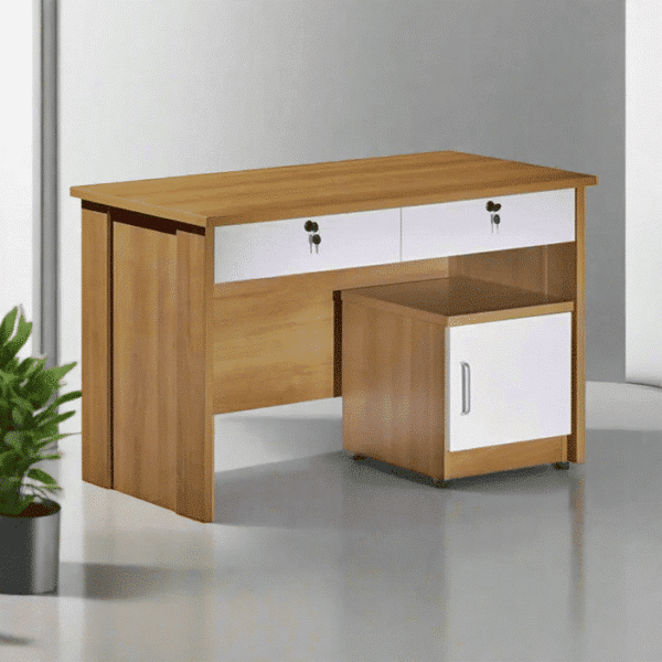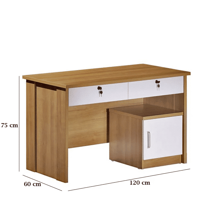 مكتب موظف 120سم أنيق و مثالي لمساحات العمل المكتبية.تم تصنيعه من خشب م دي اف عالي الجودة لضمان المتانة والثبات على المدى الطويل مع لمسة فاخرة من الأناقة.يتميز المكتب بسطح واسع يوفّر مساحة كافية لوضع الأجهزة المكتبية، الملفات، والأوراق بطريقة منظمة ومريحة أثناء العمل. كما يحتوي على وحدة تخزين جانبية عبارة عن ضلفة بالاضافة الي درجين بعرض المكتب لتخزين الأدوات المكتبية الصغيرة والمستندات اليومية،.يجمع المكتب بين اللونين الخشبي الطبيعي والأبيض العصري، مما يضفي لمسة راقية تتناغم بسهولة مع مختلف أنماط الديكور سواء في المكاتب الإدارية أو المنزلية.كما أن تصميمه العملي يساعد على تنظيم مساحة العمل وتقليل الفوضى، ليمنحك تجربة عمل مريحة ومنتجة طوال اليوم.