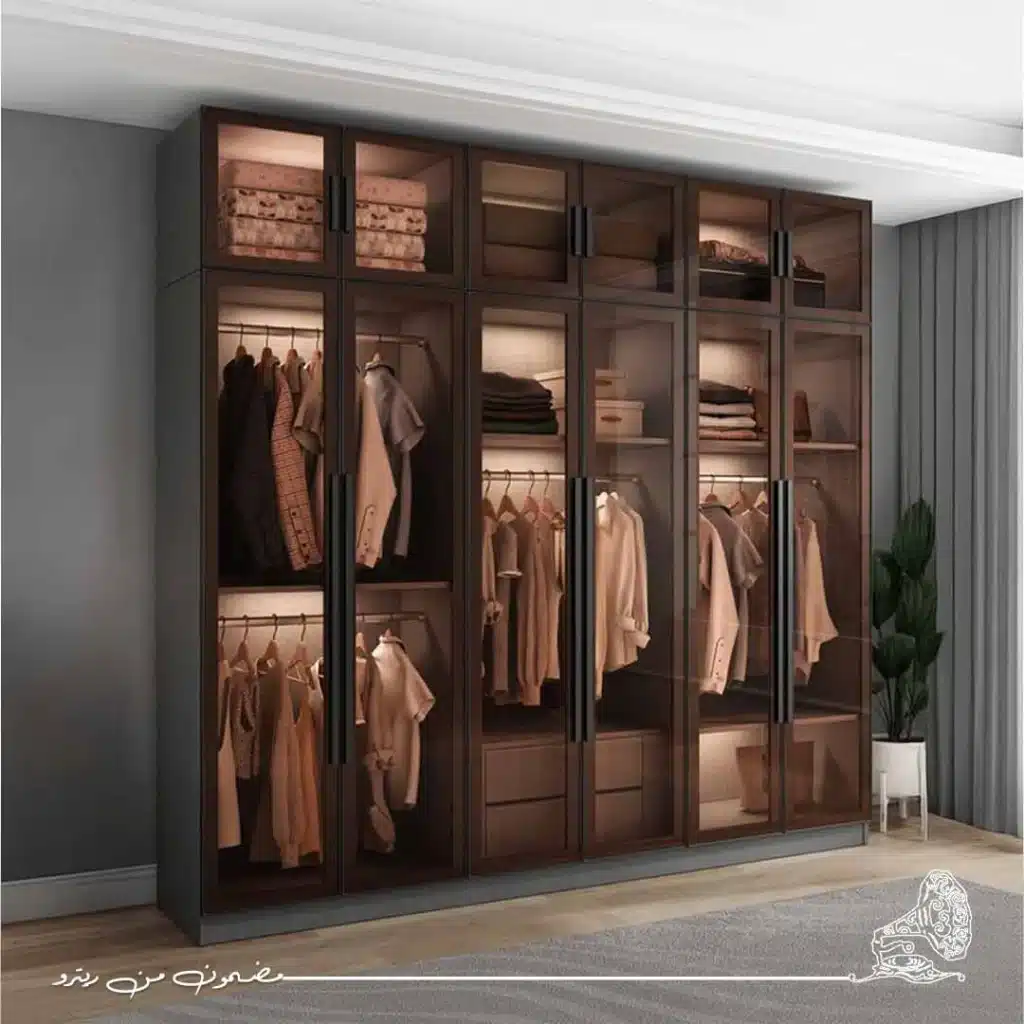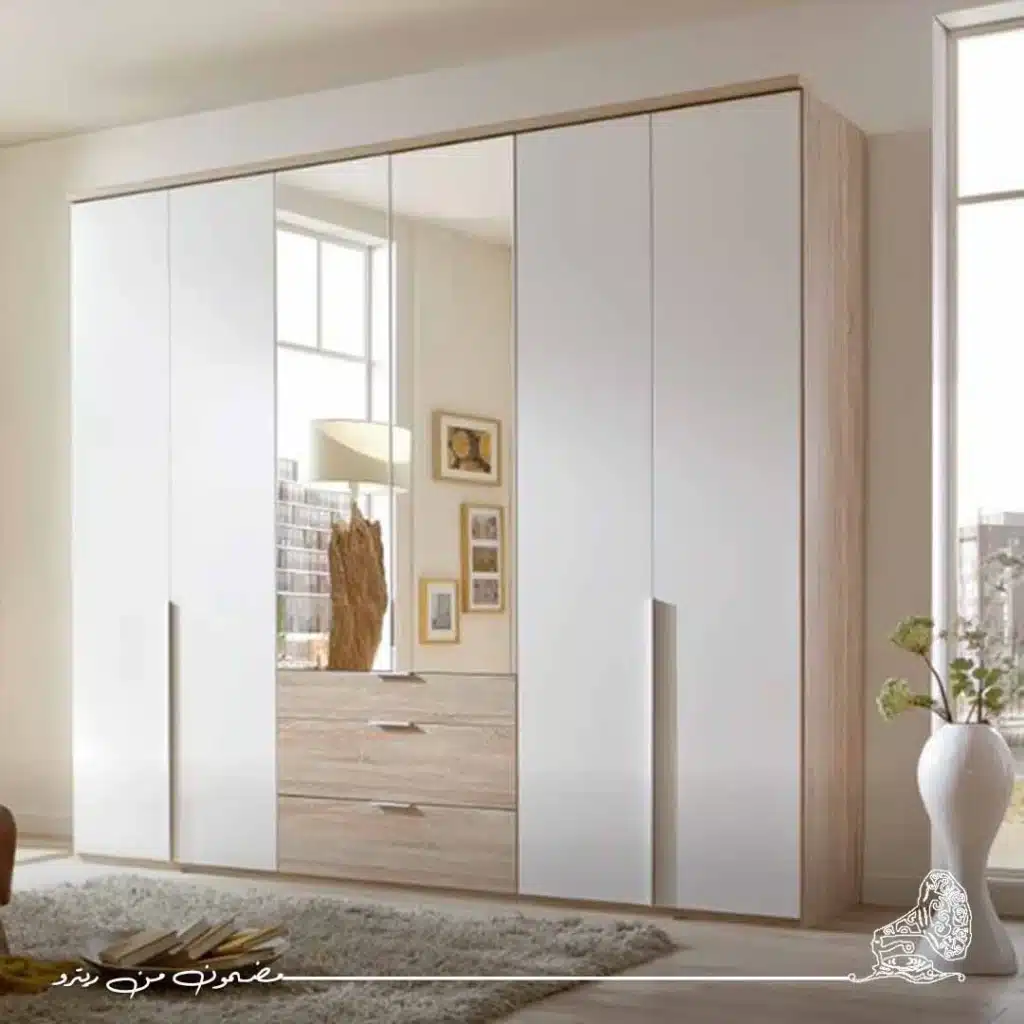 - الدولاب يتكون من 3 ضلف ، تحتوي كل من الضلفة اليسري واليمني على رف وشماعات ، وتحتوي الضلفة الوسطي على 4 أرفف