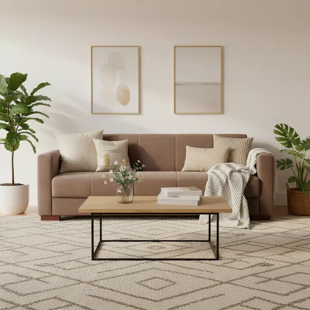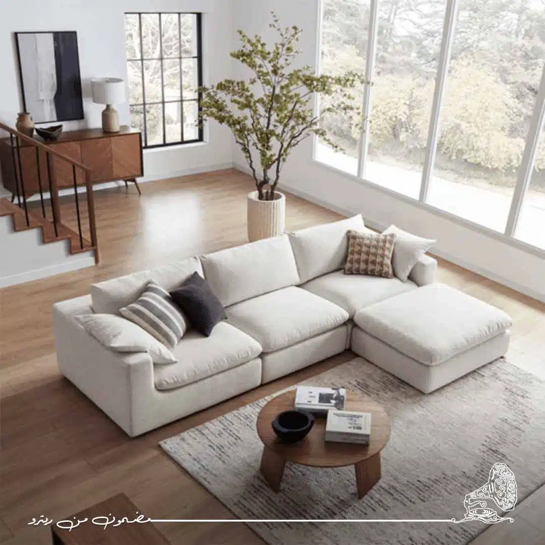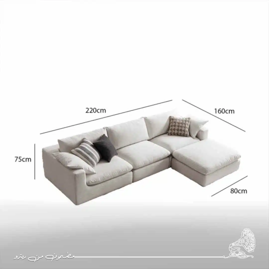 ركنة مودرن بلون البيج الدافئ، تصميمها عصري وأنيق يناسب مختلف ديكورات غرفة المعيشة. تجمع بين الراحة والفخامة، مع خامات عالية الجودة وتفاصيل مميزة تضفي جو من الأناقة والدفء على المكان