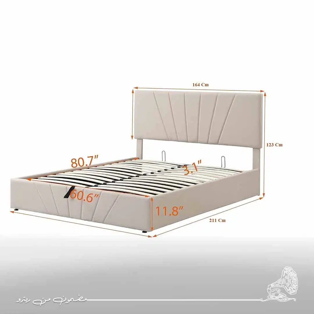 سرير سحارة 164×211 سم . سرير بتصميم ذكي يوفّر لك مساحة إضافية للتخزين دون أن يؤثر على جمال الغرفة. صنع السرير من الخشب الطبيعي مع لمسه راقيه بتنجيد فاخر من قماش الكتان الناعم بلون البيج فاتح مما يضيف المزيد من الرقي و الراحة علي غرفة نومك يتميز السرير بظهر عالي مزين بتفاصيل أنيقة وعصرية يأتي السرير مزودًا بنظام ميكانيزم مريح للفتح والغلق، ليسهّل عليك تخزين الألحفة، الوسائد، بطريقة منظمة وسهلة