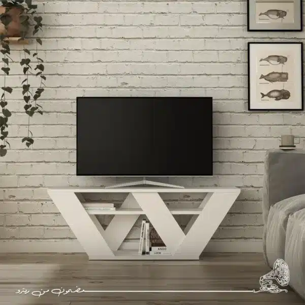 ترابيزة تلفزيون باللون الأبيض تصميم بسيط وعصري يضفي إشراقة ونقاء على الغرفة توفر سطحًا مناسبًا لوضع التلفزيون مع وحدات تخزين عملية لترتيب الأجهزة والإكسسوارات