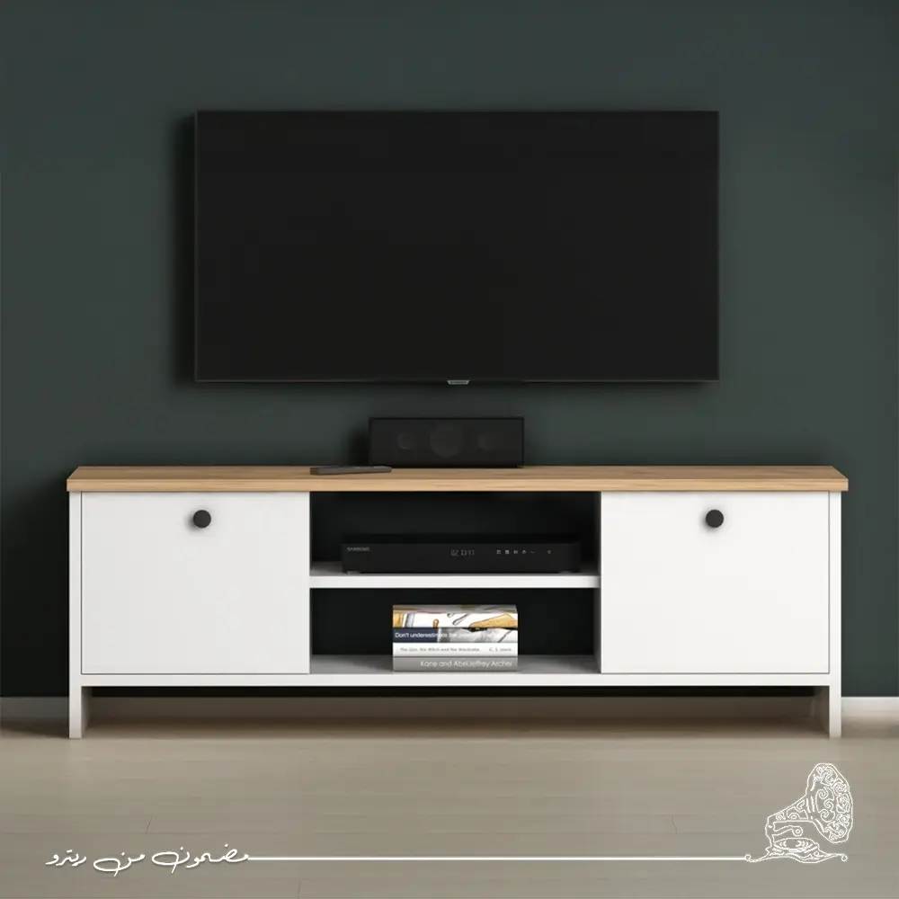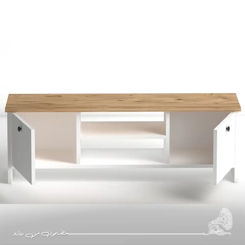 ترابيزة تلفزيون بتصميم مودرن أنيق يجمع بين الأبيض النقي والبيج الدافئ، تضفي أجواء هادئة وعصرية على غرفة المعيشة. توفر مساحة واسعة لوضع التلفاز مع أرفف تخزين عملية تساعد في تنظيم الأجهزة والقطع الزخرفية بشكل مرتب وأنيق