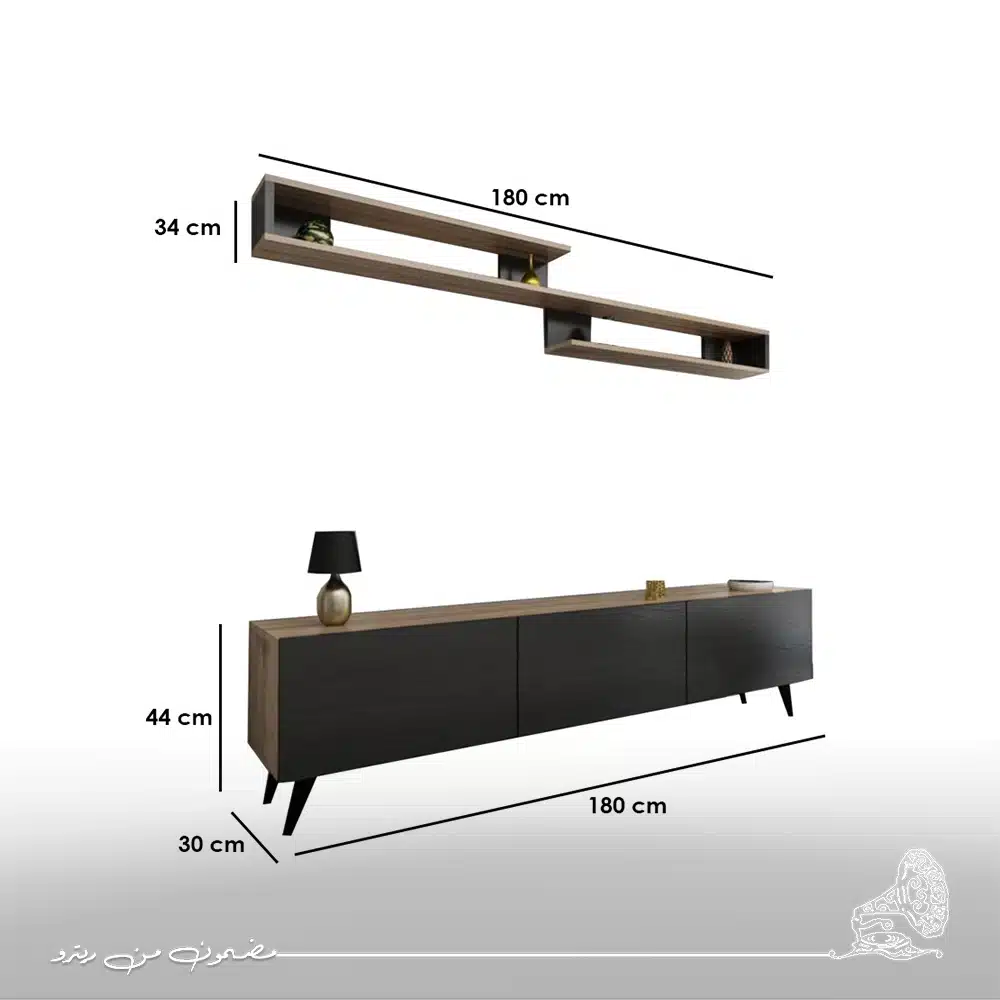 ترابيزة تلفزيون 180 سم مع وحدة حائطية تضيف لمسة من الفخامة والترتيب لغرفة المعيشة . تصميمها يجمع بين الألوان الجذابة والتفاصيل العملية لتلبية جميع احتياجاتك اليومية.ترابيزة التلفزيون 180 سم مصنوعة من خشب عالي الجودة وفق معايير الاتحاد الأوروبي، مما يمنحها متانة وقوة تدوم طويلاً.تتميز الترابيزة بثلاث ضلف ورفّين علويين لتخزين الأجهزة الإلكترونية، مستلزماتك الشخصية أو عرض الديكورات بطريقة منظمة وأنيقة. تأتي القطعة باللون البيج مع الأسود، ما يمنح الغرفة تباينًا جذابًا ويضيف لمسة من الفخامة العصرية التي تتناغم مع مختلف أنماط الديكور الداخلي. تصميم الترابيزة والوحدة الحائطية البسيط والأنيق يجعلها خيارًا مثاليًا لكل من يقدّر الجمال والوظائف العملية معًا.
