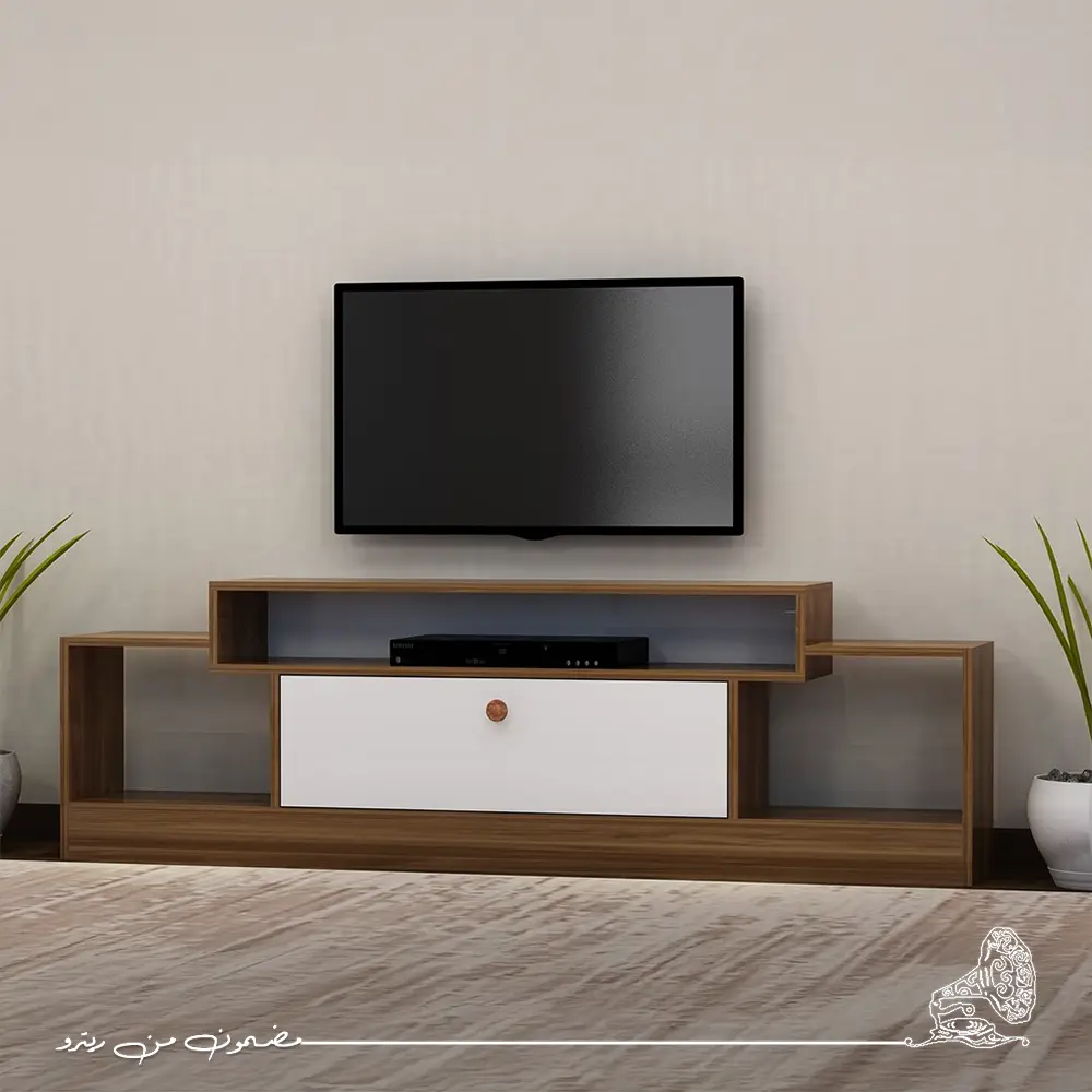 ترابيزة تلفزيون أنيقة تجمع بين اللون البني الدافئ والأبيض النقي لتضفي توازنًا بصريًا راقيًا على المساحة تصميمها العصري يوفر سطحًا واسعًا لوضع التلفزيون ومساحات تخزين متعددة لتنظيم الأجهزة والإكسسوارات مصنوعة من خامات متينة تمنحها الثبات والمتانة وتكمل ديكور الغرفة بأسلوب عملي وأنيق