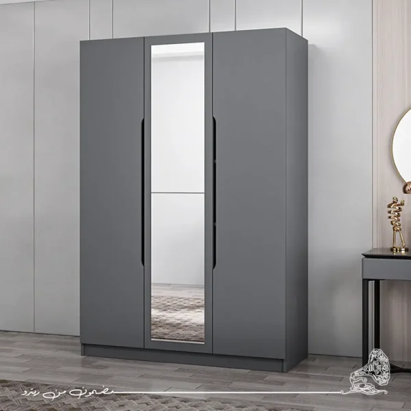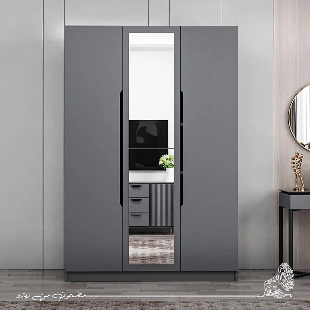 دولاب ملابس مودرن باللون الرمادي بتصميم أنيق وهادئ يضفي لمسة راقية على الغرفة. يجمع بين البساطة والعملية، ويوفر مساحة منظمة لترتيب الملابس والأغراض بسهولة. اختيار مثالي لعشاق الألوان المحايدة والديكور العصري المتوازن