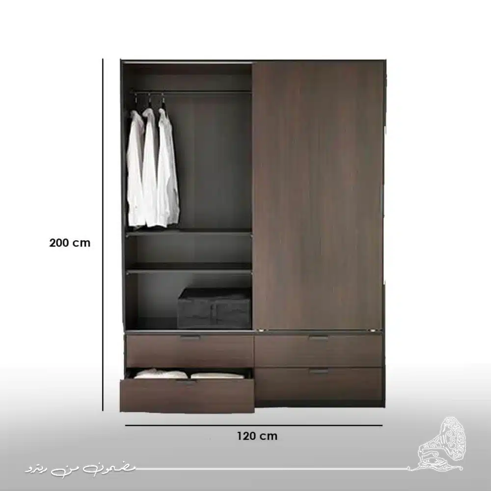 دولاب مودرن 120سم عملي وأنيق مصنوع من خشب ام دي اف عالي الجودة يجمع بين المتانة والتصميم العصري يتميز الدولاب بوجود ضلفتين جرار لتسهيل الوصول إلى الملابس، اسفلهم 4 أدراج صغيرة لتخزين الأغراض الصغيرة مقسم من الداخل الي شماعة و عدة أرفف لترتيب الملابس الطويلة والقصيرة بشكل منظم ومرتب يتألق الدولاب باللون البني مما يجعله كقطعه ديكور مميزة في منزلك